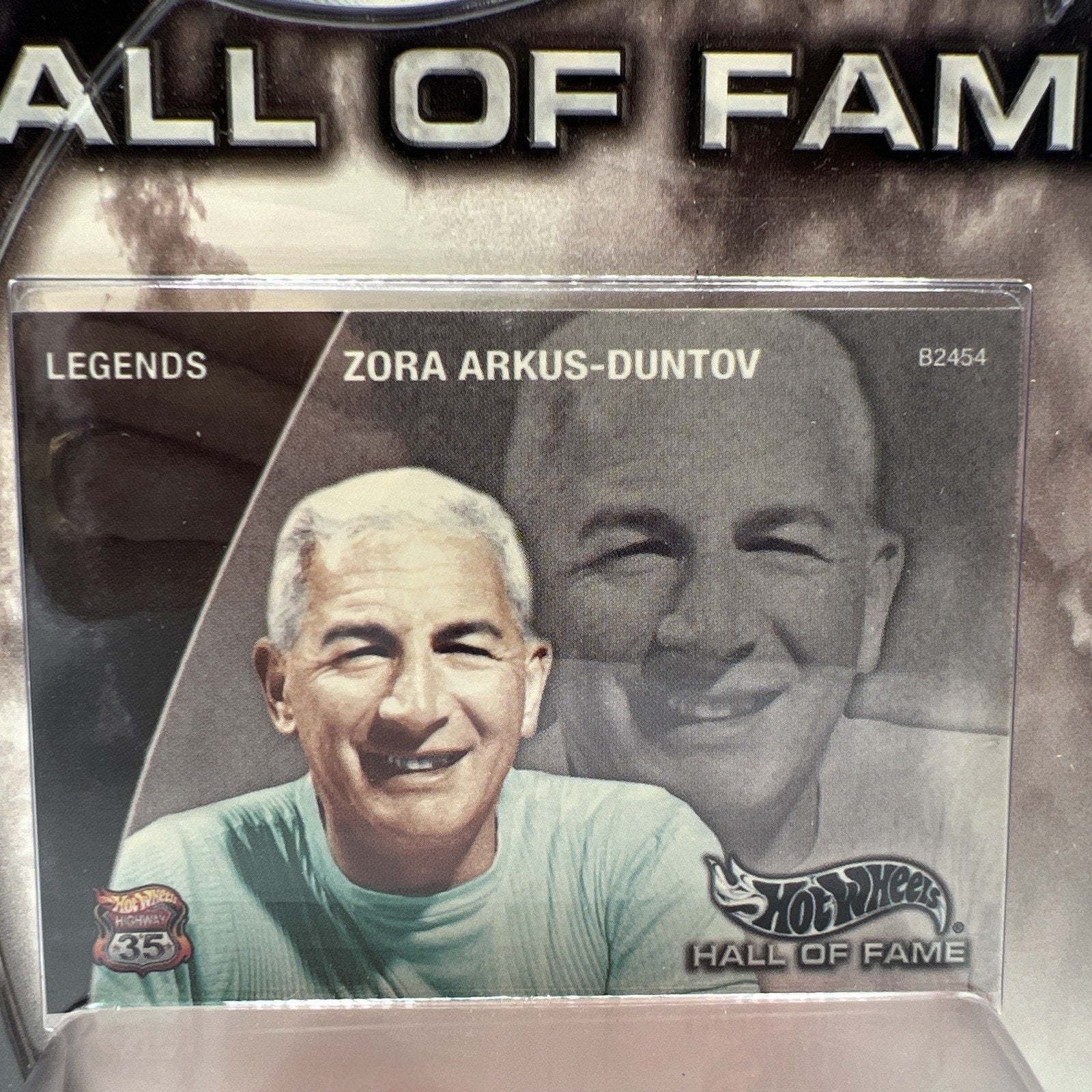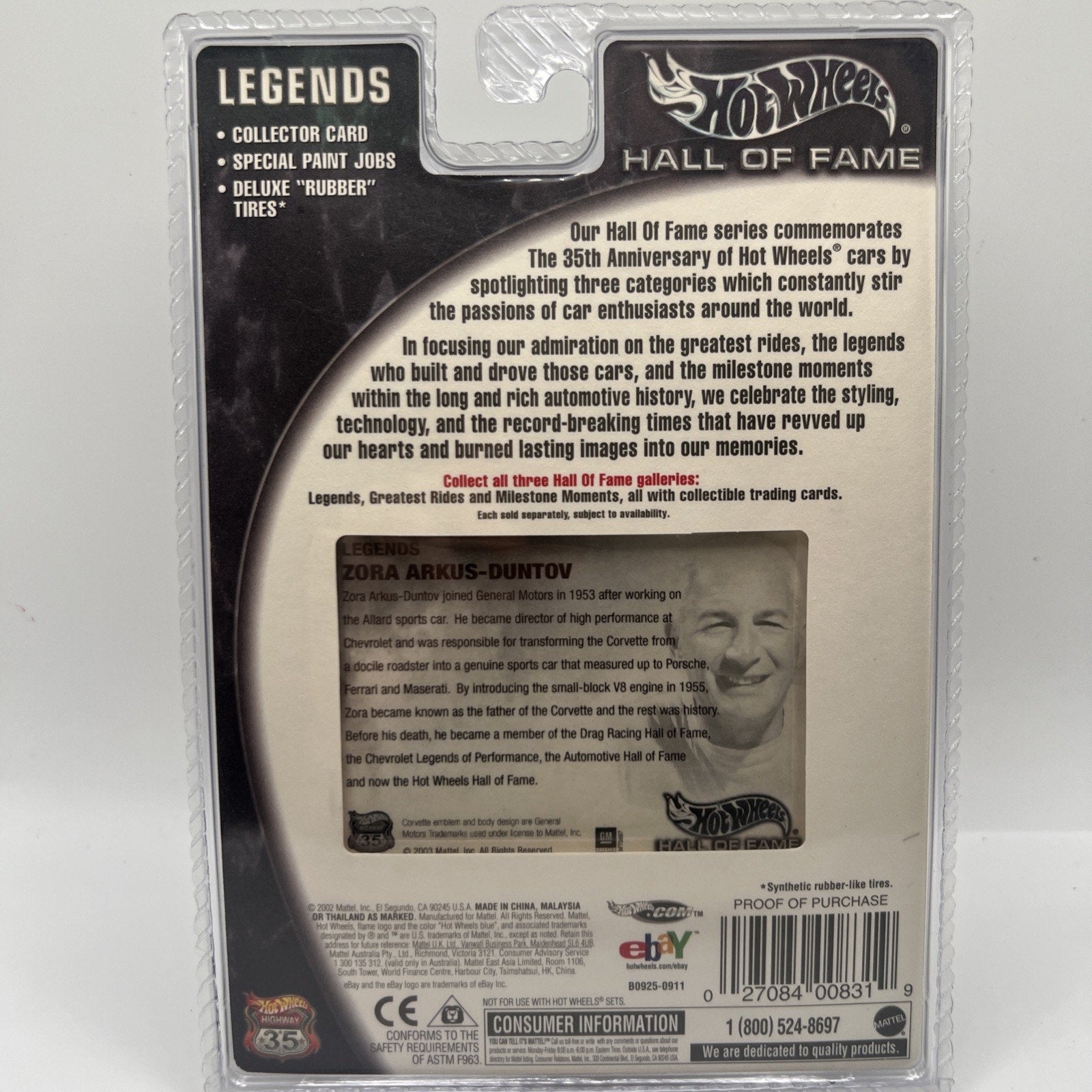 The product is a 2001 Hot Wheels Hall Of Fame Legends Zora Arkus-Duntov Corvette 1:64 diecast car. This collectible toy vehicle features a red Chevrolet Corvette model in a 1:64 scale, made with diecast material in Malaysia. It is part of the Hall Of Fame series by Hot Wheels, celebrating legendary vehicles and drivers in the world of motorsports. This particular model pays homage to Zora Arkus-Duntov, a renowned automotive designer, and his iconic Corvette.