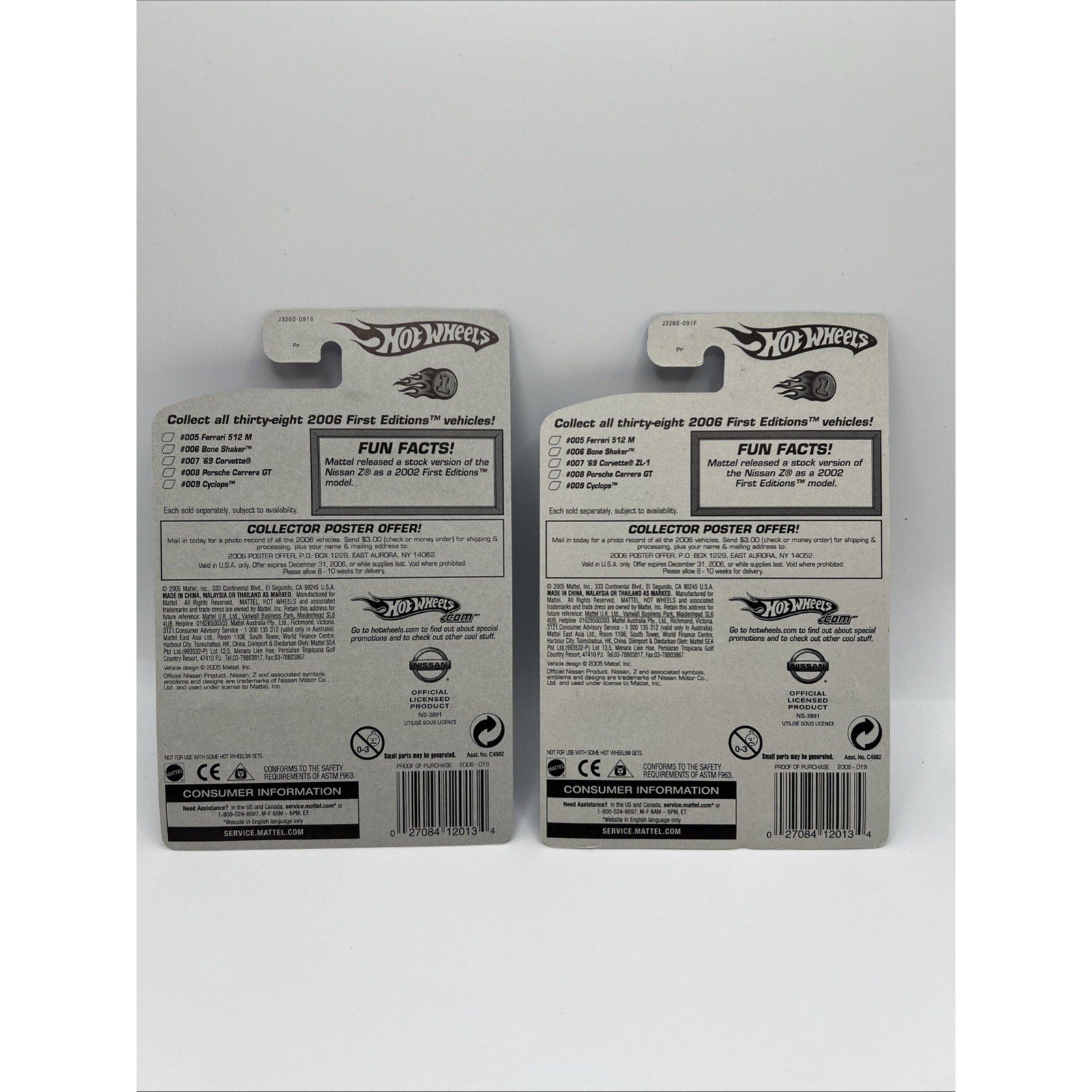 The Hot Wheels 2006 1st Edition Nissan Z in yellow and FTE Version 19/38 Plus Ultra bundle includes both wheel versions of the Nissan Z car, part of the 2006 First Editions series by Hot Wheels. The diecast vehicles are in 1:64 scale and come in unopened boxes, making them a special edition collectible set suitable for boys and girls aged 3 and up. Featuring the Rotora theme, these vehicles are a part of the contemporary manufacture line of toy and hobby cars.