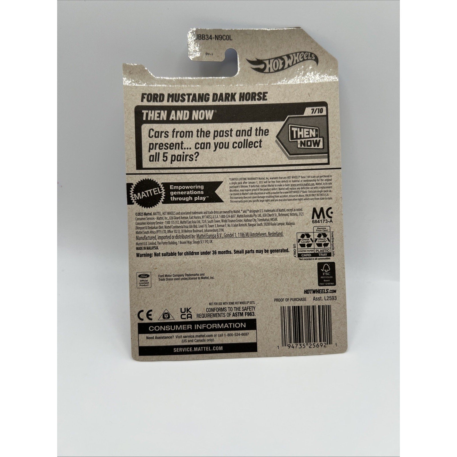 The Hot Wheels 2025 Ford Mustang Dark Horse 7/10 #219 Then and Now White Race Car is a diecast toy vehicle made of metal and plastic. This 1:64 scale car features a white color and depicts a 2025 Ford Mustang Dark Horse model, with a design inspired by the 1967 version. It is part of the Then and Now series by Hot Wheels, making it a collectible item for boys and girls of various age levels. The unopened box adds to its appeal and makes it a perfect addition to any car enthusiast's collection. Made in Malaysia, this toy car is a must-have for fans of contemporary diecast vehicles.