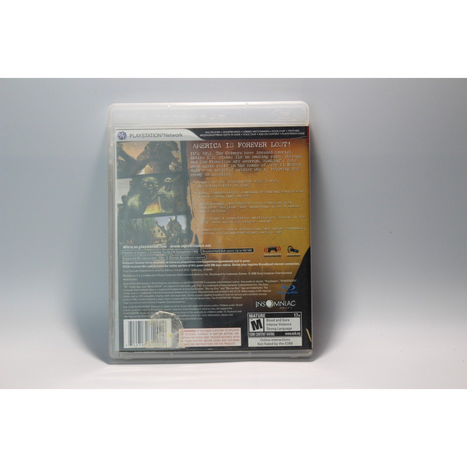 Battle an alien invasion and fight for humanity’s survival in Resistance 2 for PlayStation 3 (PS3)! This used and tested video game delivers an intense sci-fi first-person shooter experience, continuing the story of Nathan Hale as he faces the relentless Chimera threat across the United States.