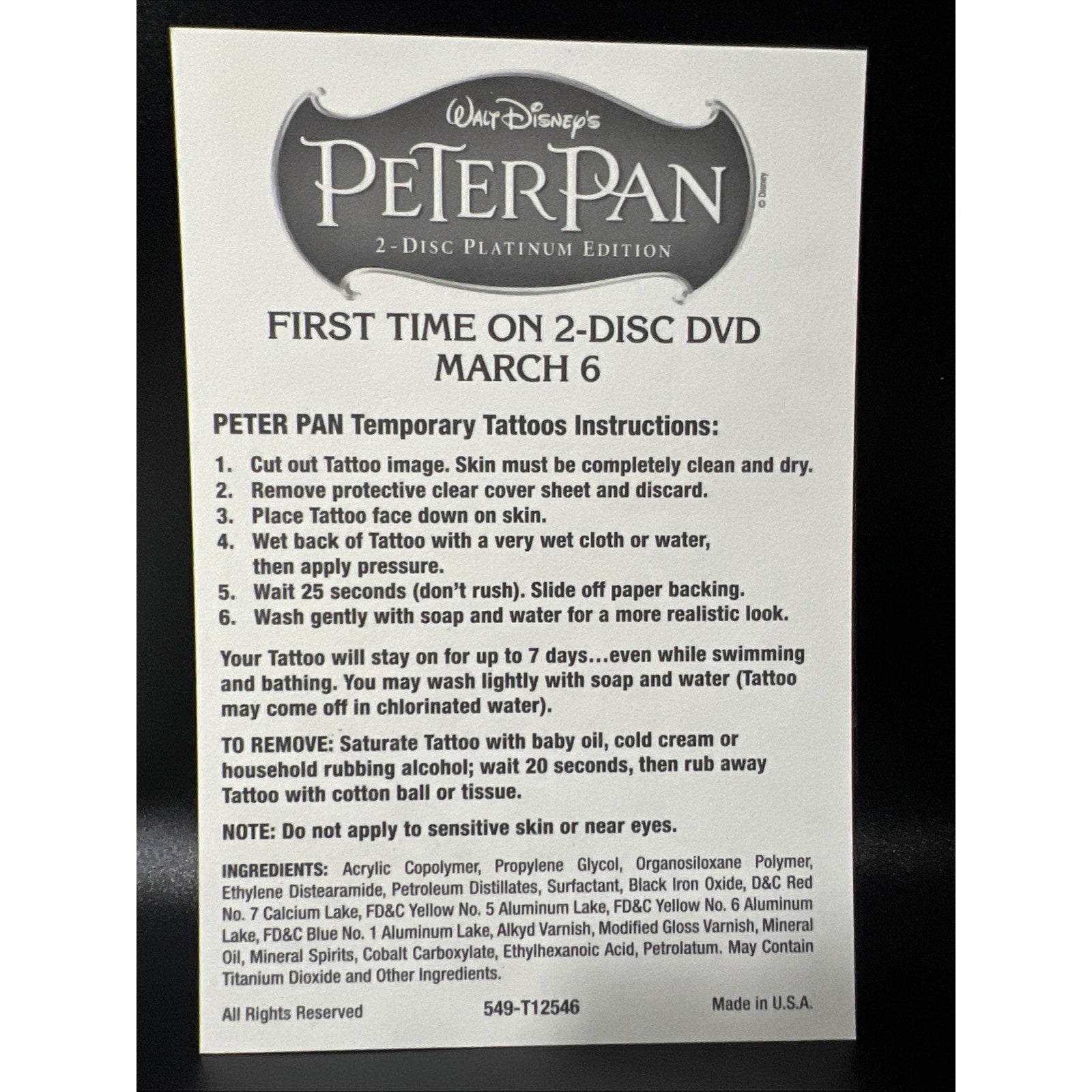 Walt Disney's Peter Pan DVD Temporary Tattoos 6 Sheets Rare Disney Movie Rewards